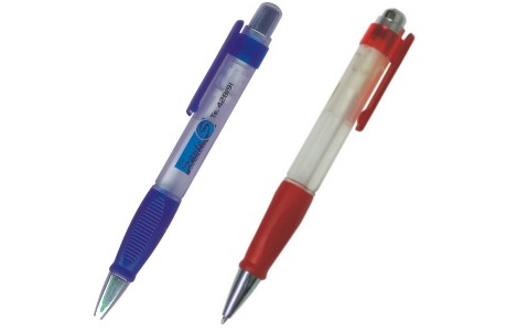 Bolígrafo transparente con detalles de color. Grip de goma. Puntera y capuchón metalizados. Retractil.