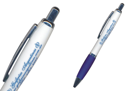 Bolígrafo cuerpo blanco, grip plástico de color, clip metálico, puntera y pulsador metalizados.