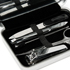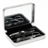 Con espejo, en caja metálica. Contiene 5 elementos: lima, corta uñas, pinzas, tijeras y limpia cutícula.