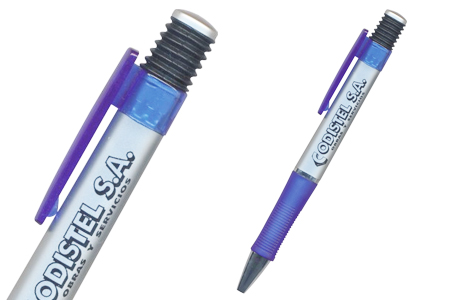 Bolígrafo cuerpo silver, detalles de color. Grip de goma de color, fuelle negro en pulsador. Puntera metalizada.