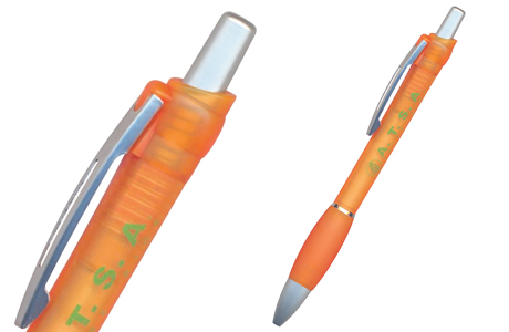 Bolígrafo cuerpo frost, grip plástico de color, clip metálico, puntera y pulsador silver.