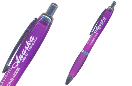 Bolígrafo cuerpo traslúcido de color, clip metálico, pulsador y puntera metalizados. Grip plástico de color.