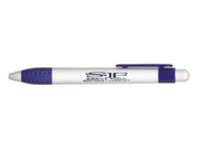 Bolígrafo cuerpo blanco, grip plástico de color, clip metálico, puntera y pulsador metalizados.